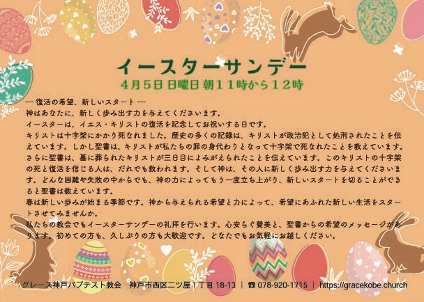 10時からは、子ども向けのイースタープログラム「キッズイースター」があります。11時からは中学生以上(小学生も参加できます) 大人の礼拝です。この日は『 教会は初めて』とおっしゃる方もお気軽に参加していただけます。また、ご参加の皆様全員に、イースターエッグをプレゼントいたします。